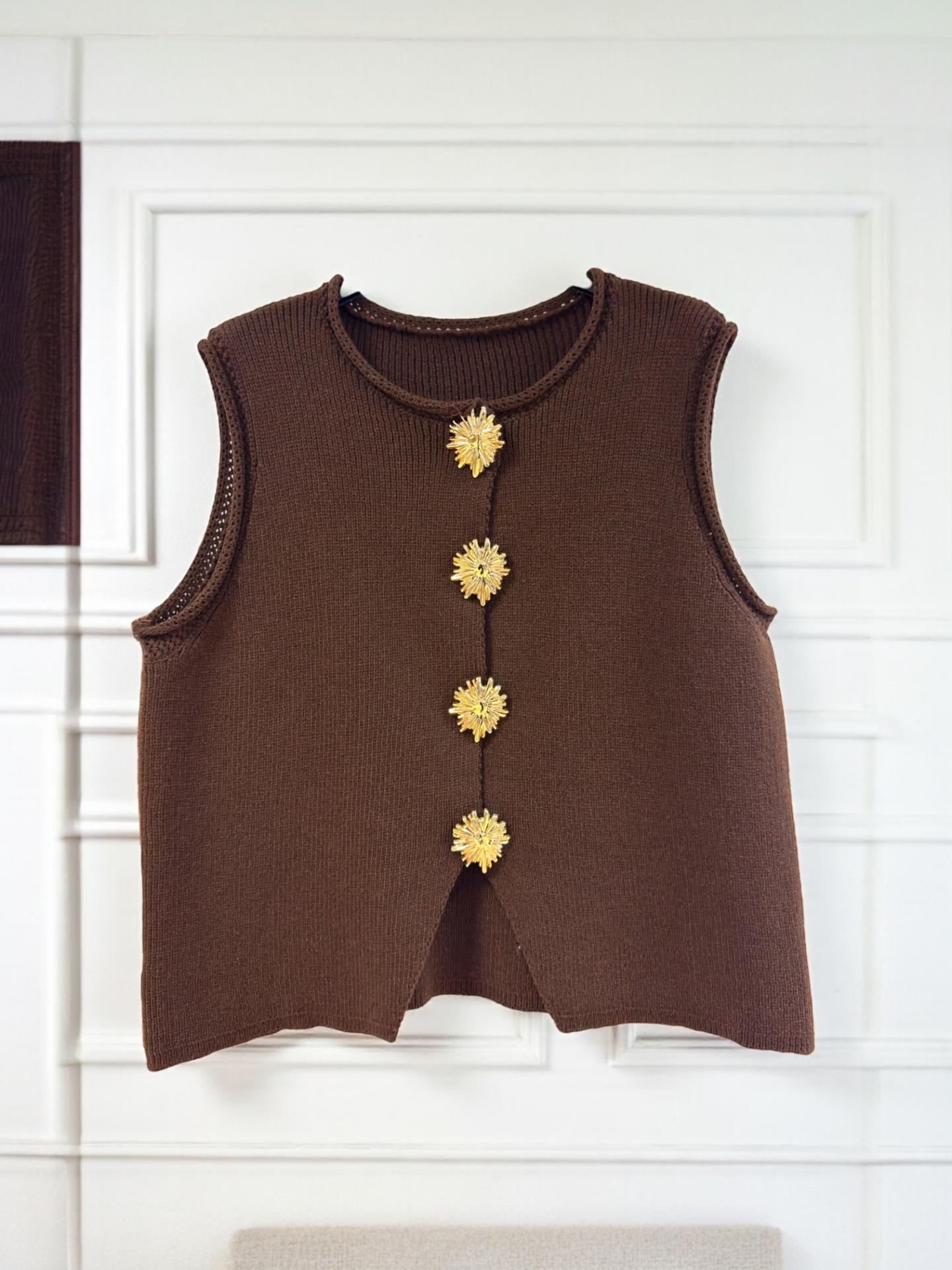 El chaleco GANIA es una joya que viene en tejido de punto con botón joya. Pelito por delante y tela acolchada por detrás. ¿Nuestro consejo? Dale un toque boho con jeans Carol o algo más clásico con el pantalón Siria y unos mocasines.