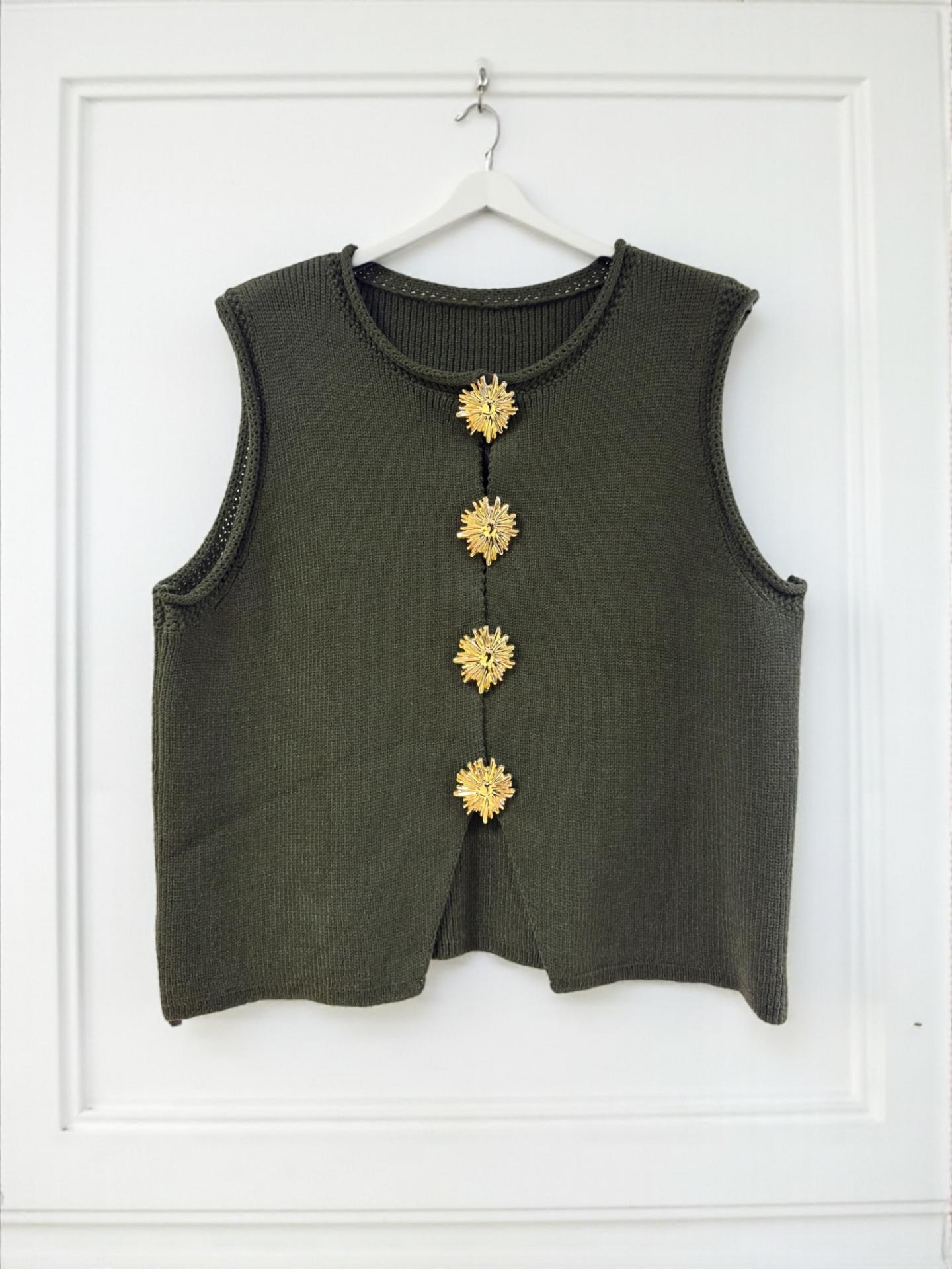 El chaleco GANIA es una joya que viene en tejido de punto con botón joya. Pelito por delante y tela acolchada por detrás. ¿Nuestro consejo? Dale un toque boho con jeans Carol o algo más clásico con el pantalón Siria y unos mocasines.