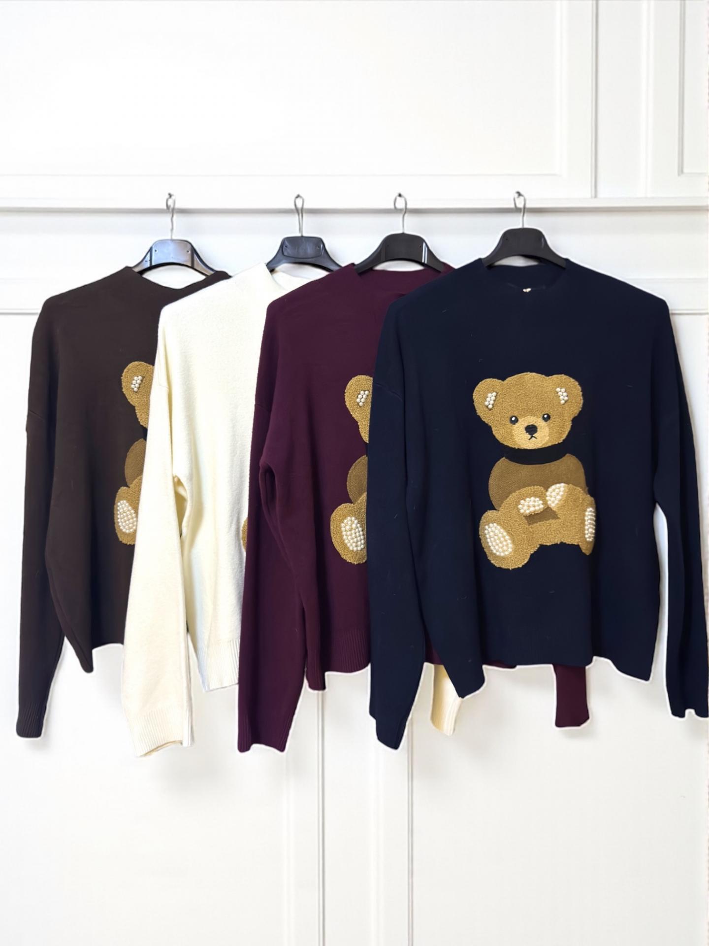 El jersey RIMIA es maravilloso tanto por su tejido agradable y calentito como el diseño tan favorecedor con el oso en relieve y perlas.