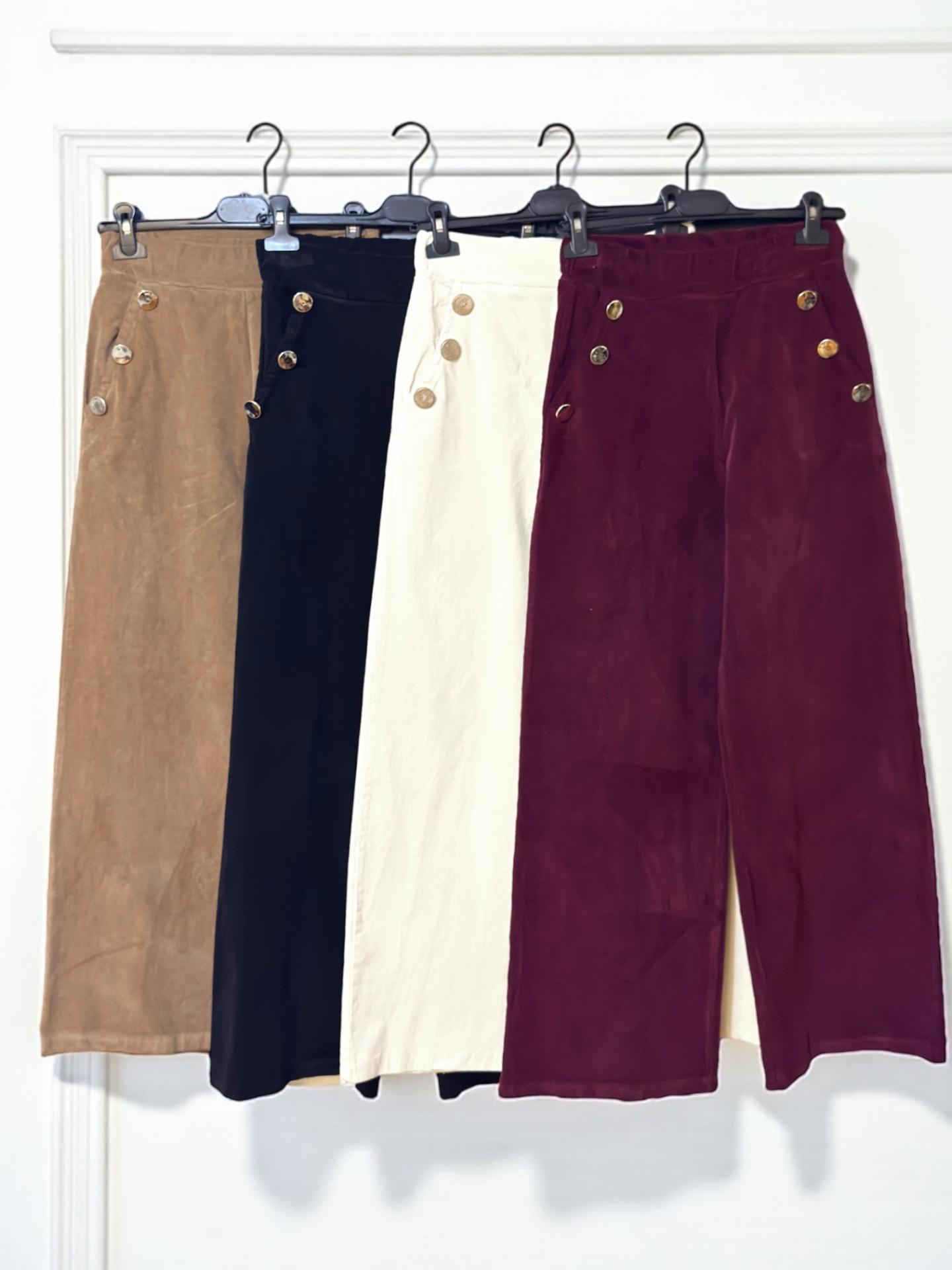 Corte recto haciendo efecto culotte, tiro medio-alto y bolsillos laterales. Es muy elástico. El tejido es una micropana aterciopelada.