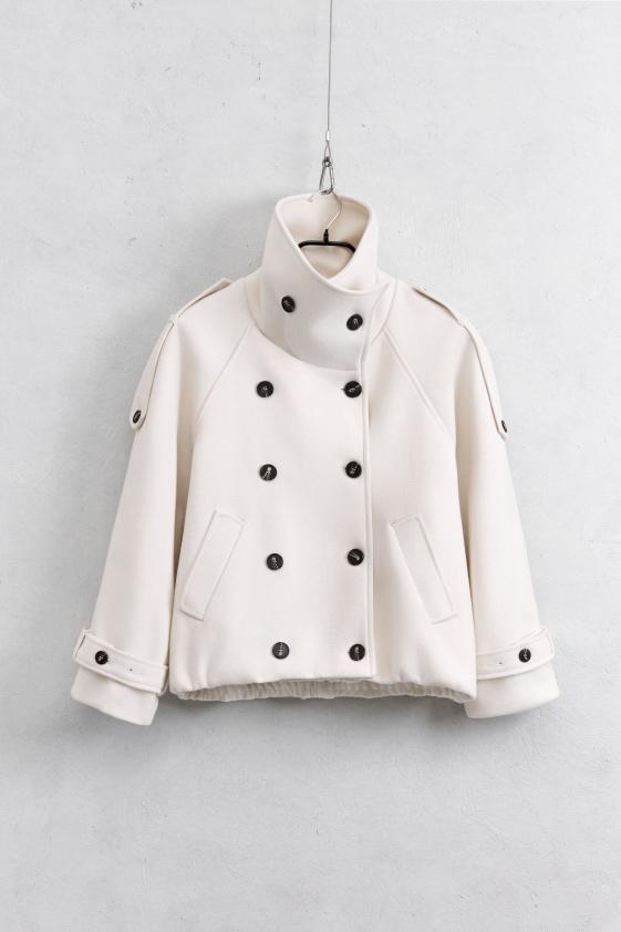 Tejido de paño completamente forrado con corte oversize. Co cuello subido si se desea.