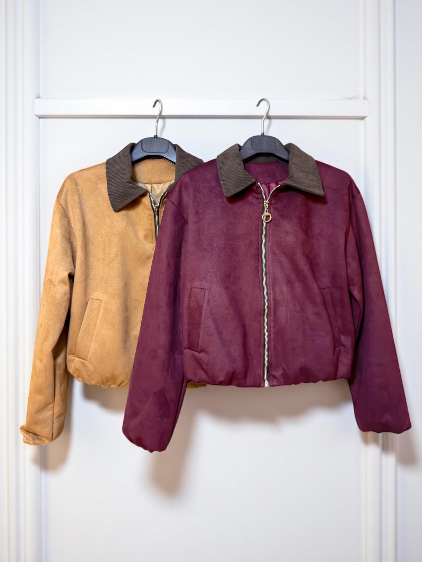 La chaqueta ÍGARO viene en tejido de ante sintético con cremallera y cuello de pana.