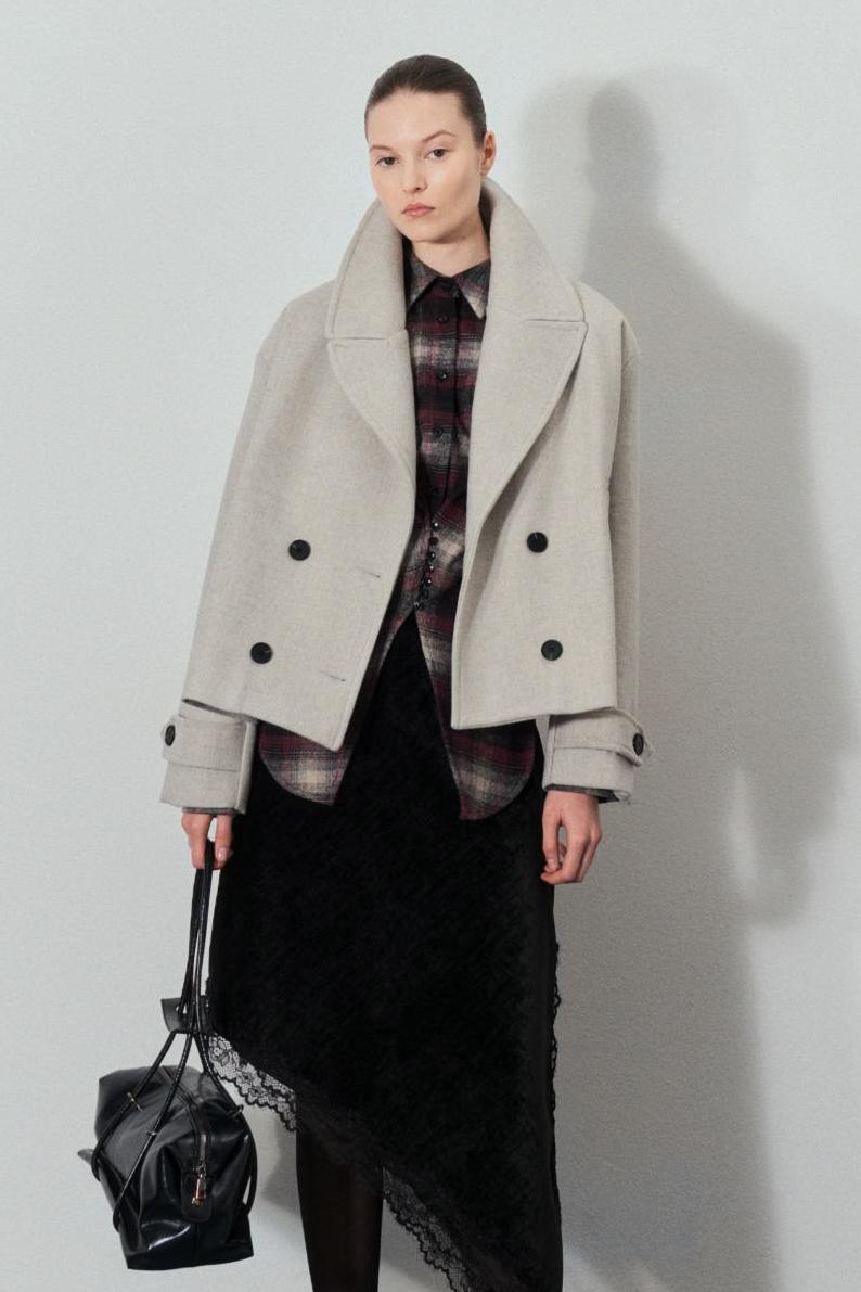 Tejido de paño completamente forrado con corte oversize. Cierre de botones.