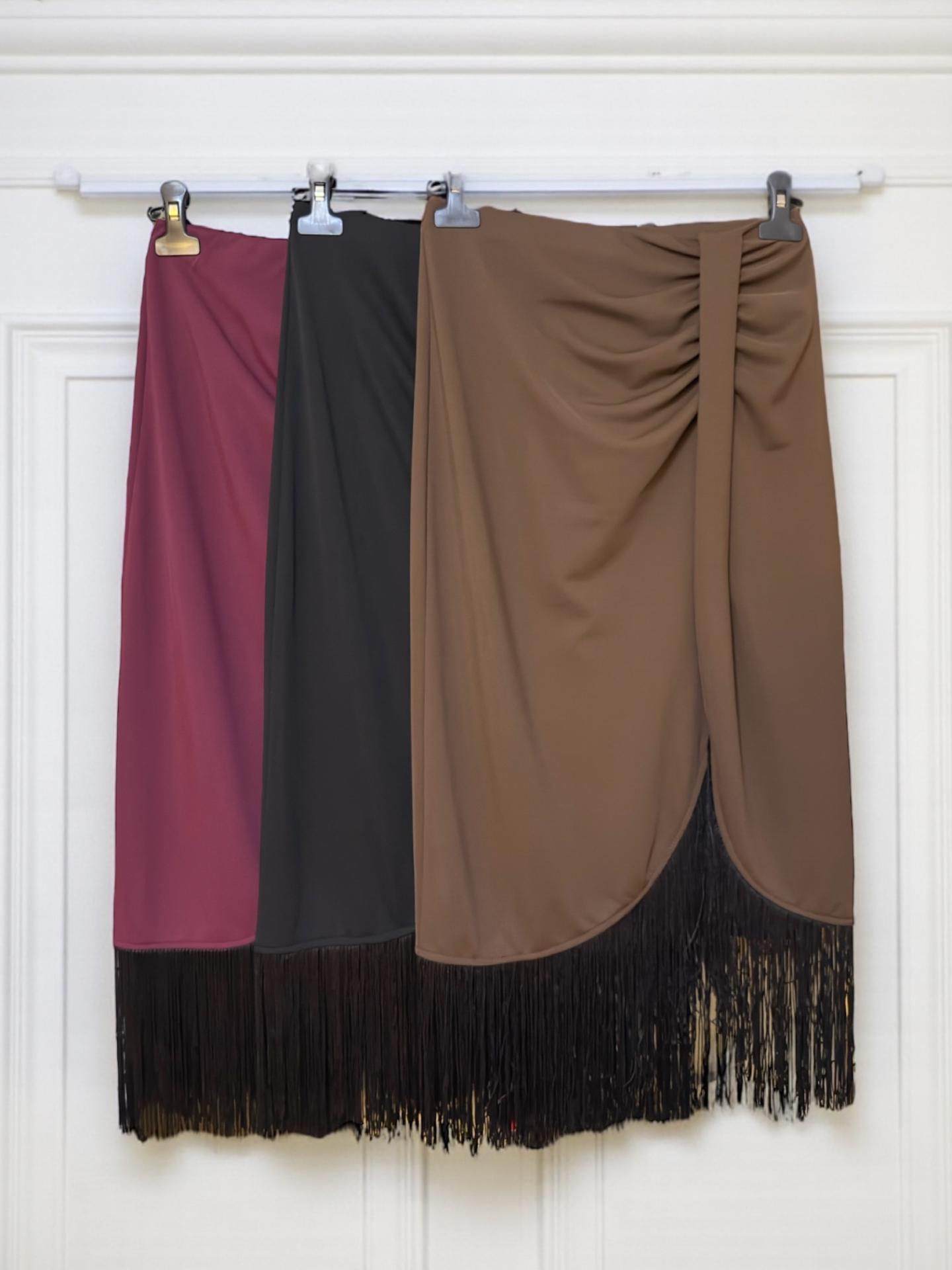 La falda NADIA es tendencia absoluta con corte recto y acabado en flecos.