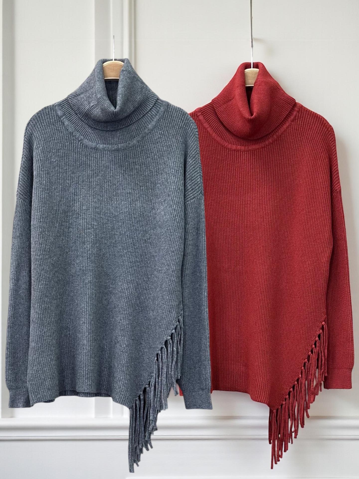 El jersey LLUIS es maravilloso tanto por su tejido agradable y calentito como el diseño tan favorecedor con flecos laterales y cuello