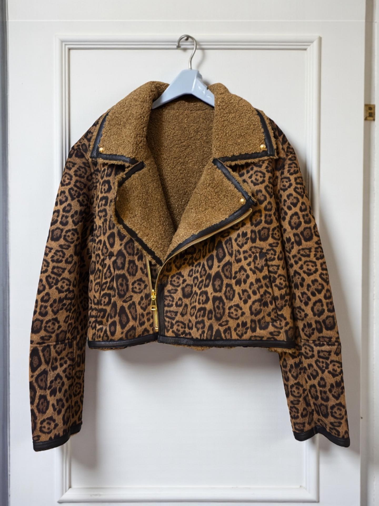 El abrigo OXANA está completamente forrado con borrego y tiene contrastes en ecopiel