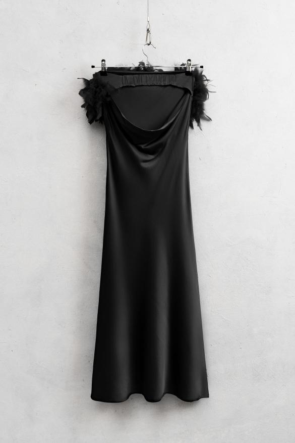 El vestido ARJONA de nuestra maravillosa casa de firma está confeccionado en satén con plumas delanteras. La parte trasera lleva goma y escote en espalda caído.