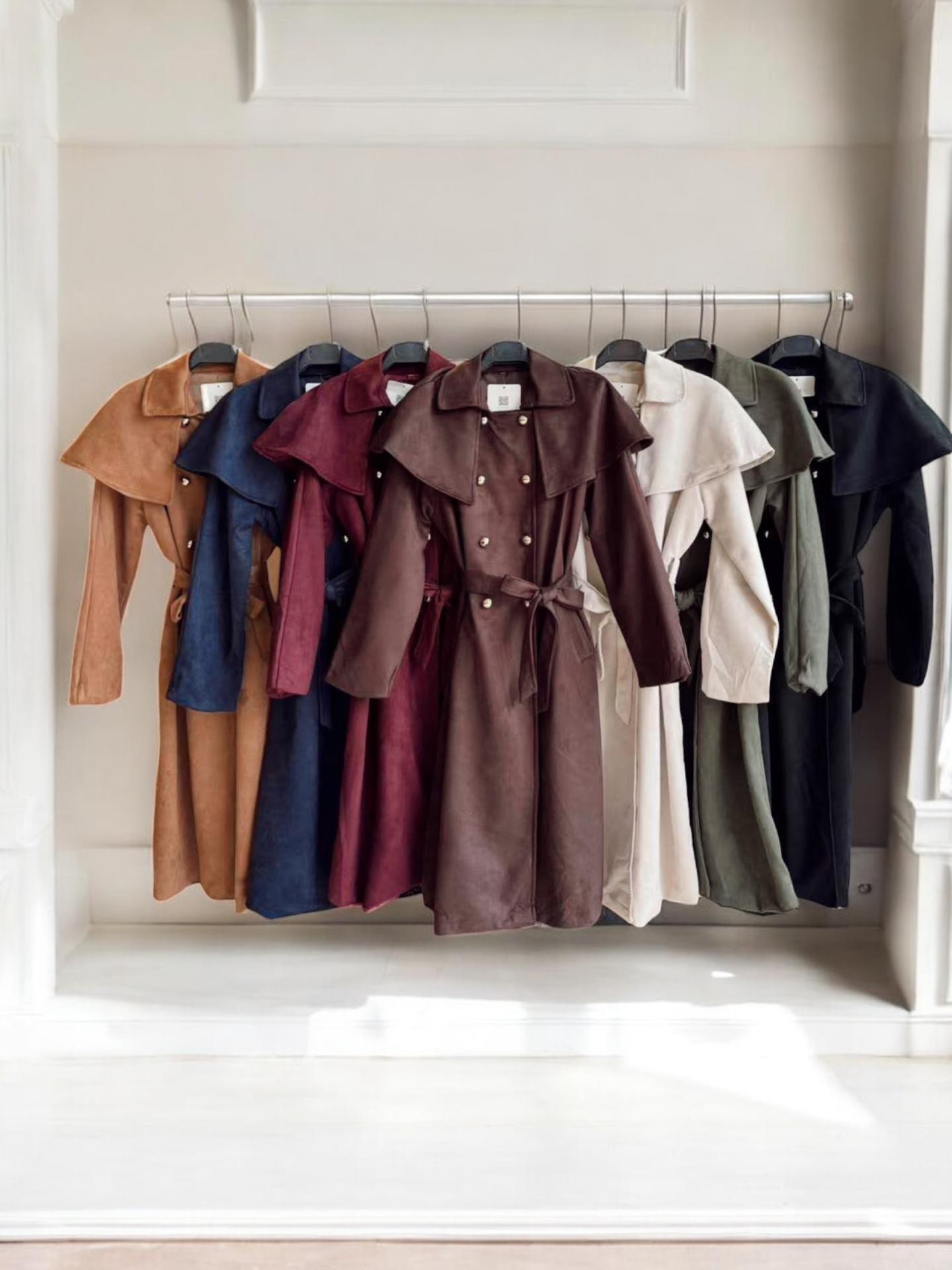 El abrigo GALA de tejido de ante sintético, con botonadura, lazada y capa