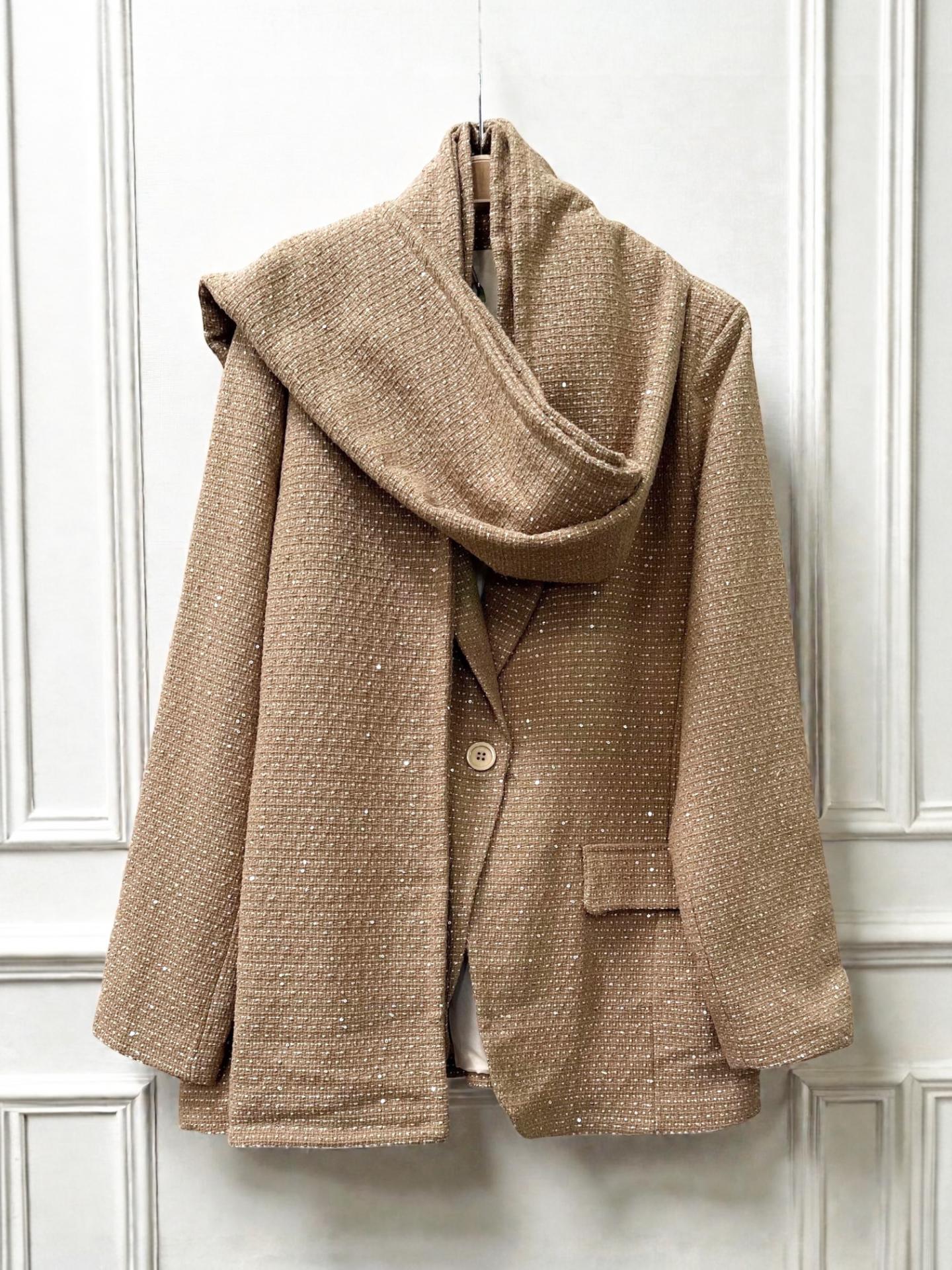 La chaqueta PARIS viene en corte amplio con un botón y detalle de bufanda.