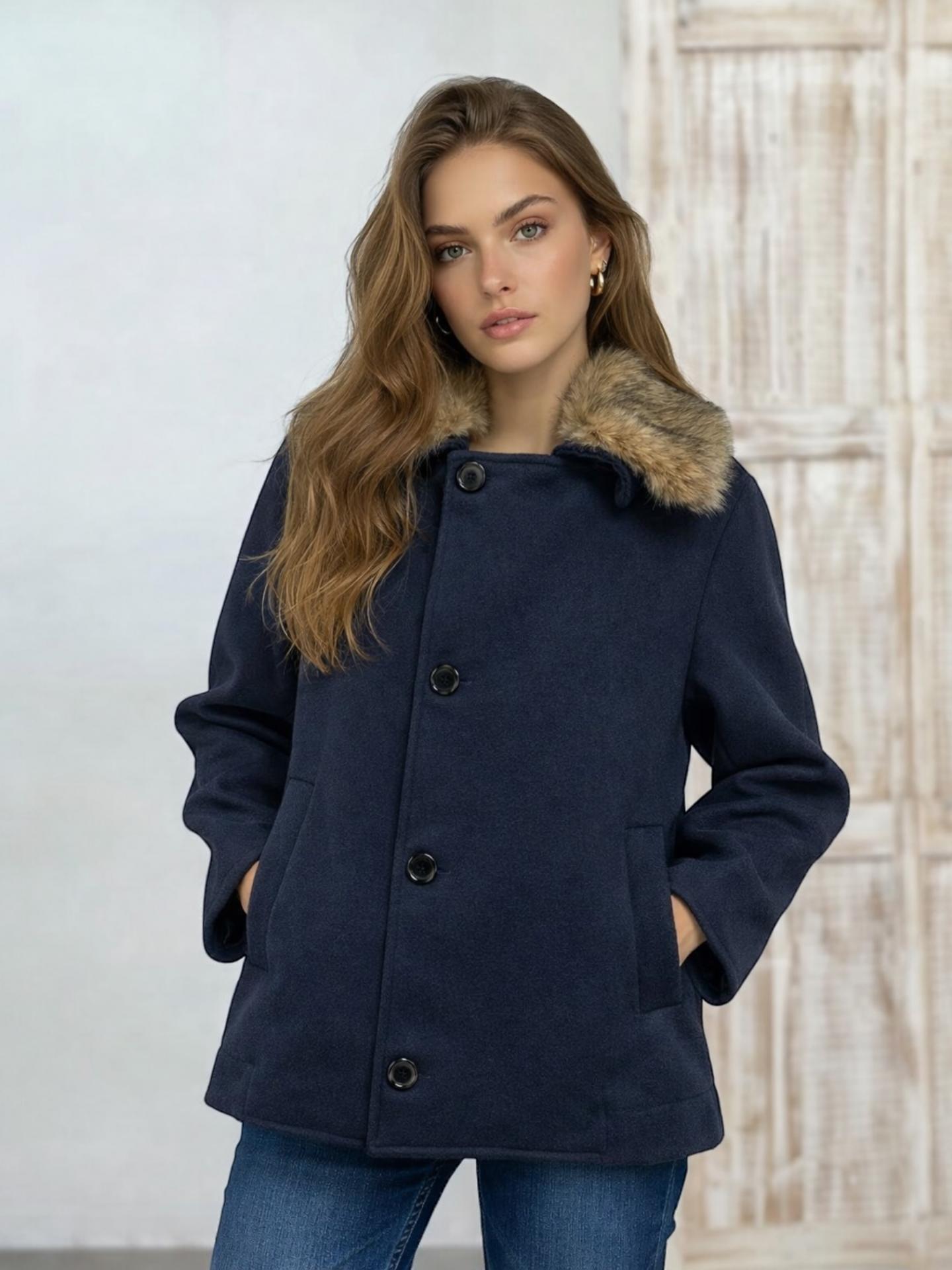 El abrigo ZINEO viene en corte básico perfecto para el día a día. Con solapas de pelo y cuerpo abotonado.