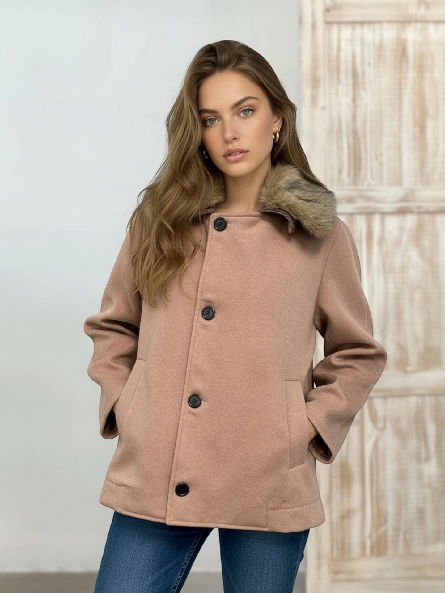 El abrigo ZINEO viene en corte básico perfecto para el día a día. Con solapas de pelo y cuerpo abotonado.