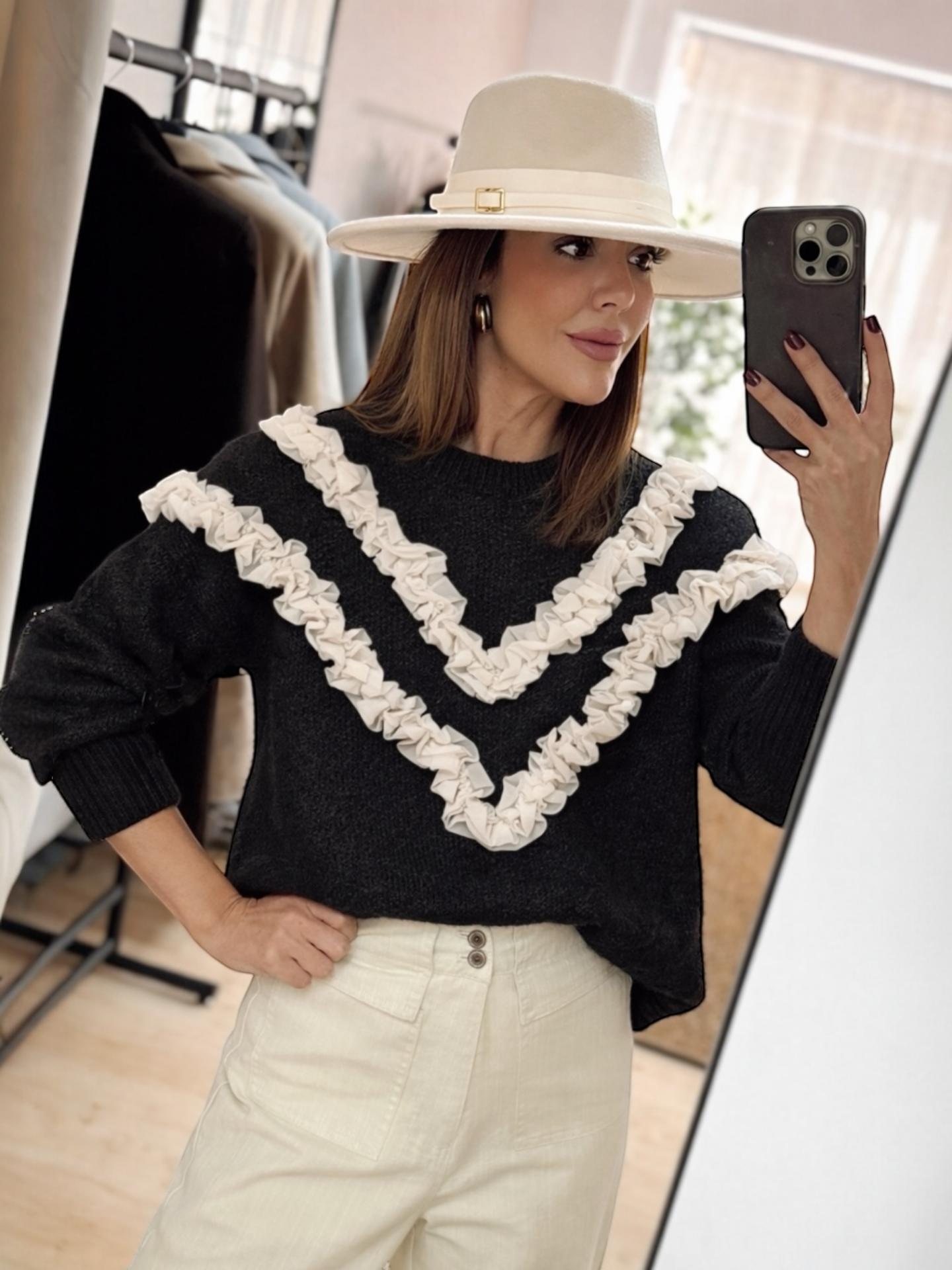 El jersey NEREA es un jersey de corte suelto y con detalle de volantes en tul y con perlas.