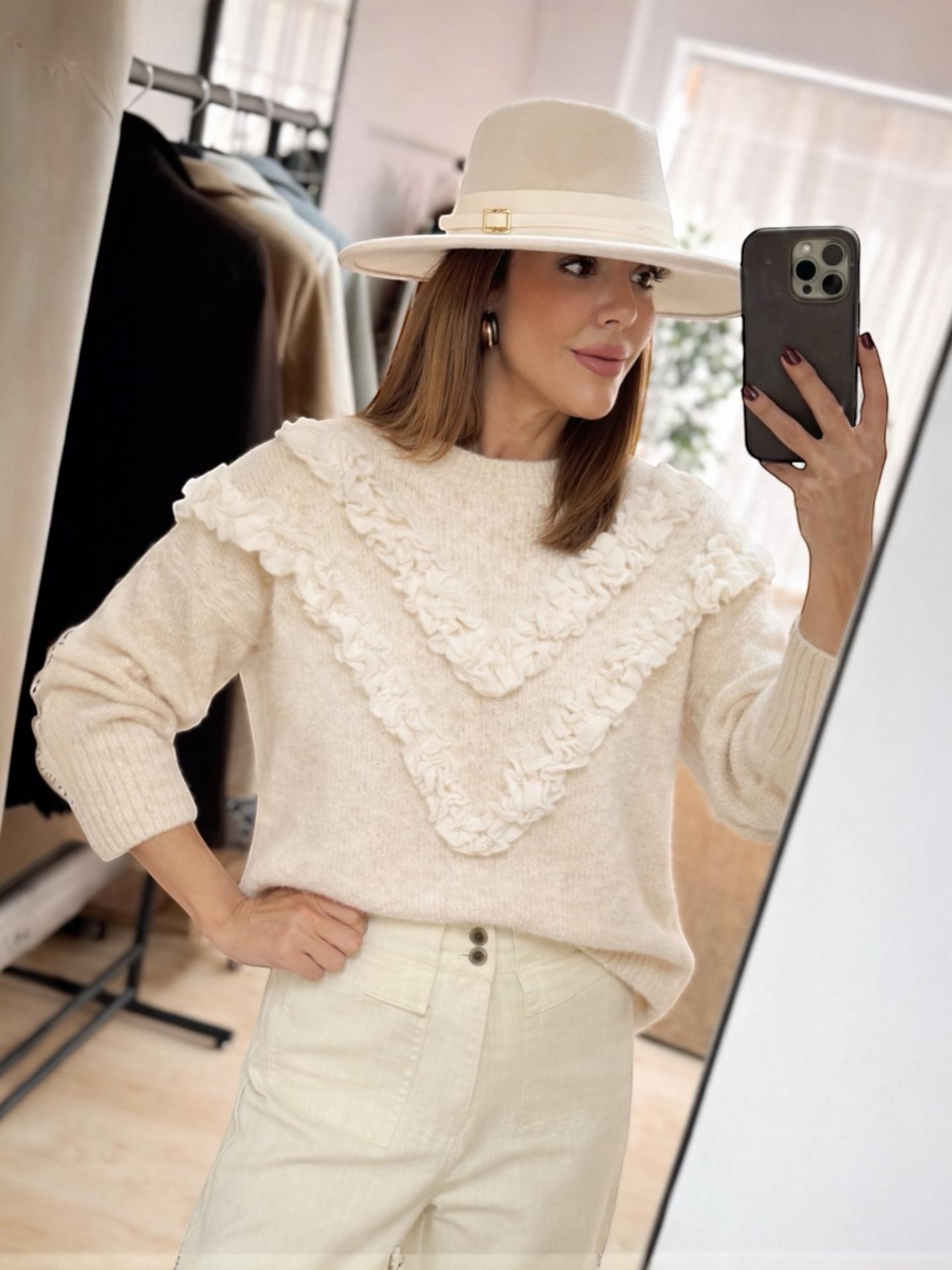 El jersey NEREA es un jersey de corte suelto y con detalle de volantes en tul y con perlas.