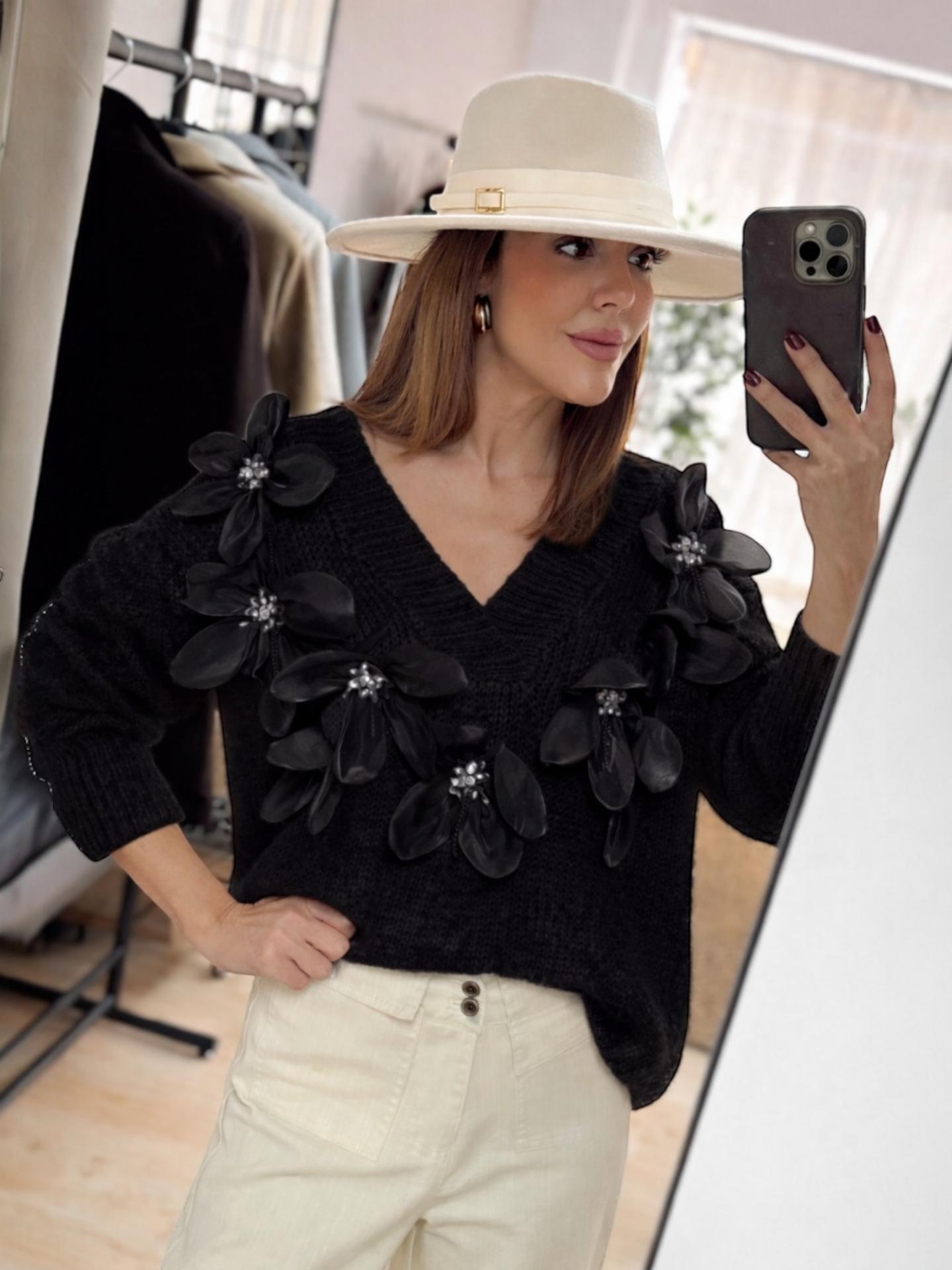 El jersey GIARAN es un jersey de corte suelto y largo con detalle de maxi flores en relieve con perlas. Es un jersey bastante abrigado.