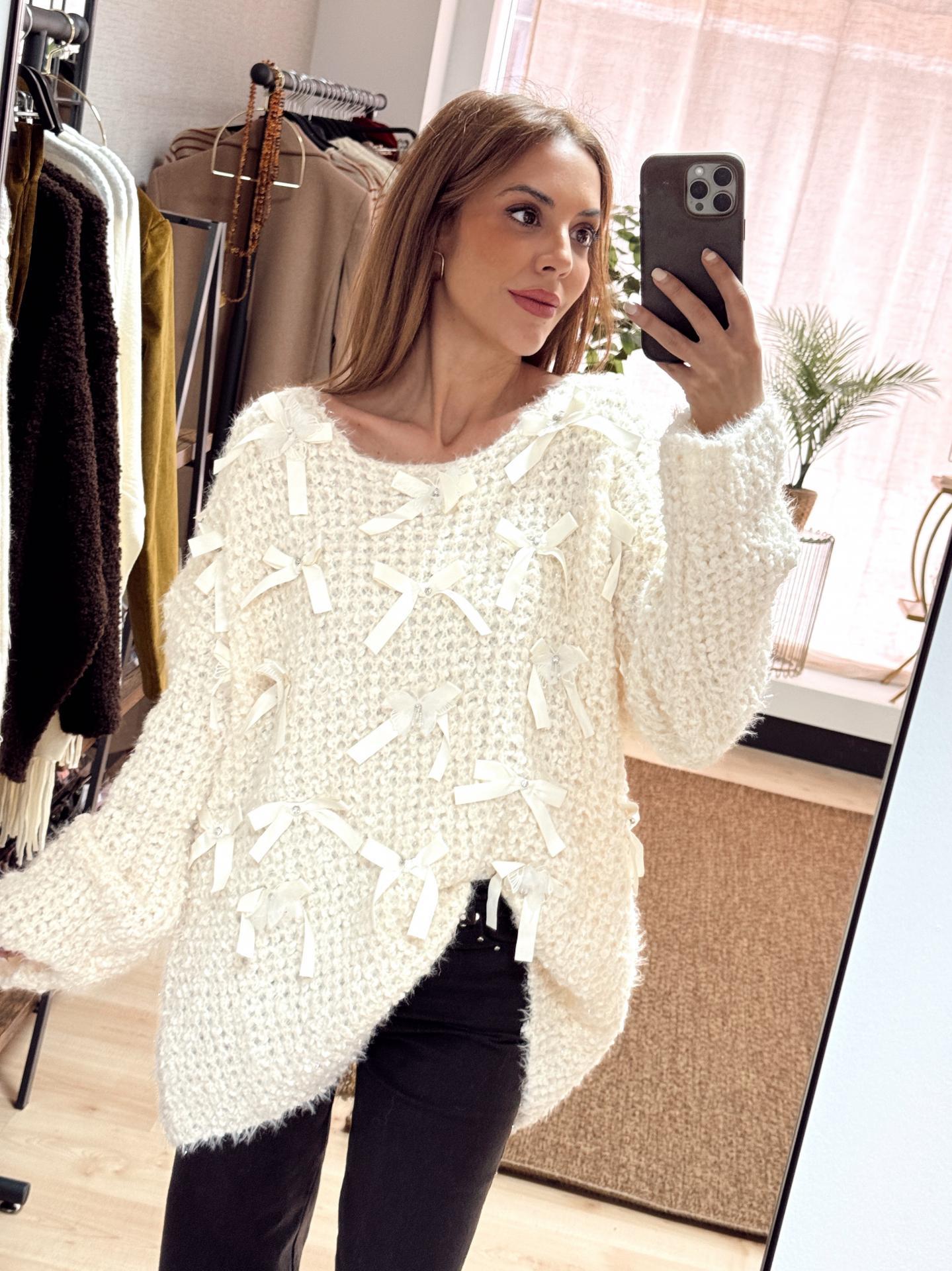 El jersey LAZOS es un jersey de corte amplio y detalle de lacitos en relieve.