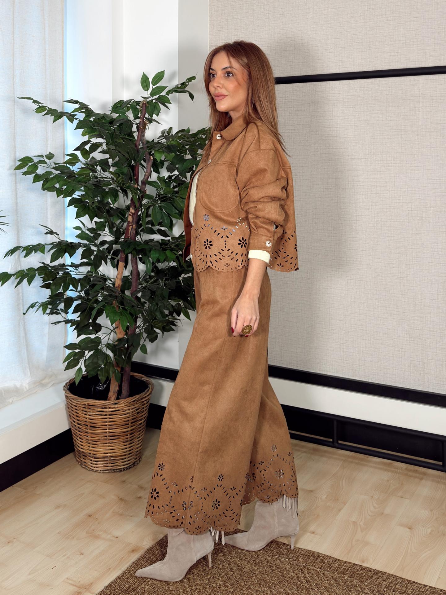 Corte recto antelina, tiro medio-alto y bolsillos laterales. Es muy elástico.
