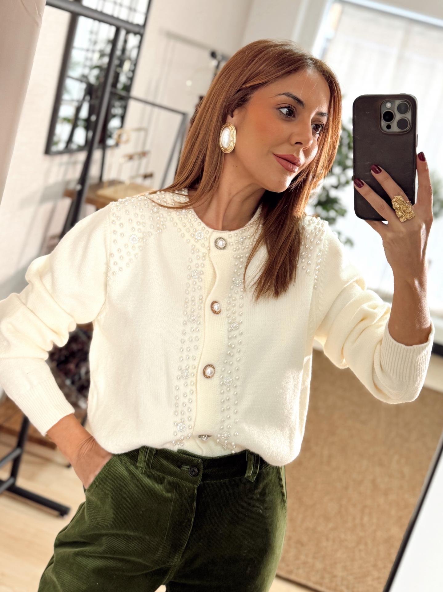 El cárdigan NEMESIS es una auténtica joya con detalle de perlas.