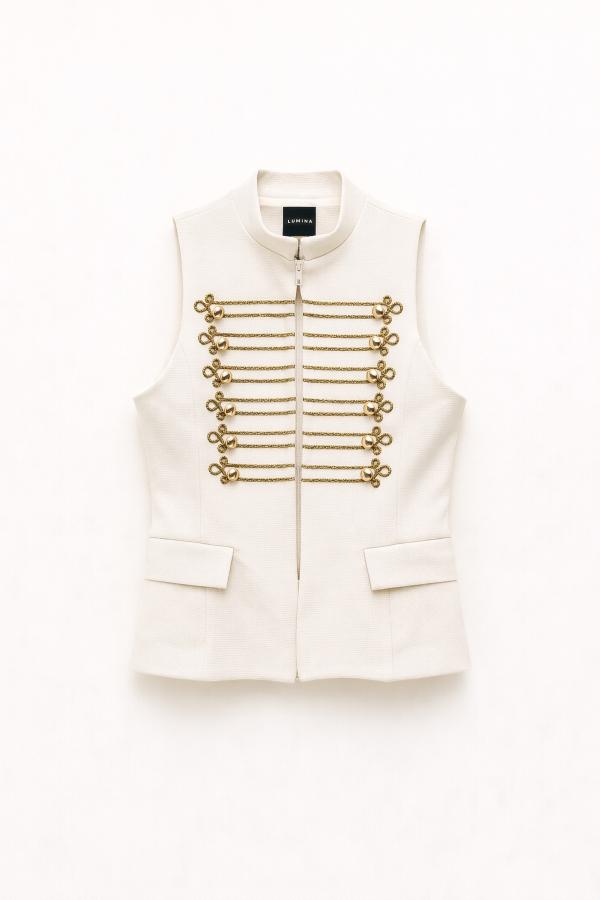 El chaleco AUTORA de nuestra maravillosa casa de firma está confeccionado con un maravilloso tejido completamente forrado y enganches a modo botón.