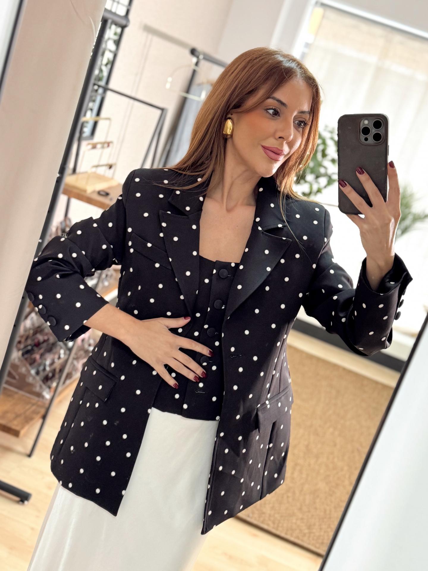 La chaqueta GABRIELA de nuestra maravillosa casa de firma viene en un espectacular tejido con detalle de peplum en los laterales de la chaqueta con efecto acolchado. Corte entallado y con chaleco a juego si se desea. Está completamente forrado y con hombreras