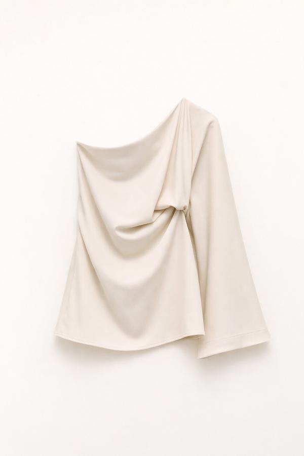El top BONAY de nuestra maravillosa casa de firma viene en corte asimétrico con cremallera lateral y fruncido en lateral. La manga es larga con forma acampanada. Talla pequeño.