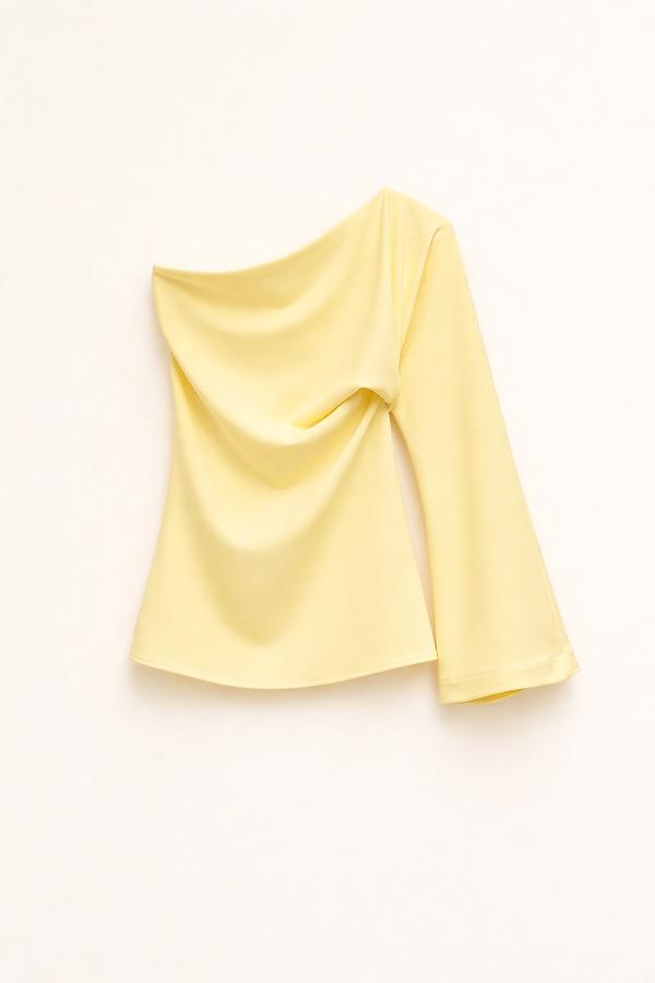 El top BONAY de nuestra maravillosa casa de firma viene en corte asimétrico con cremallera lateral y fruncido en lateral. La manga es larga con forma acampanada. Talla pequeño.