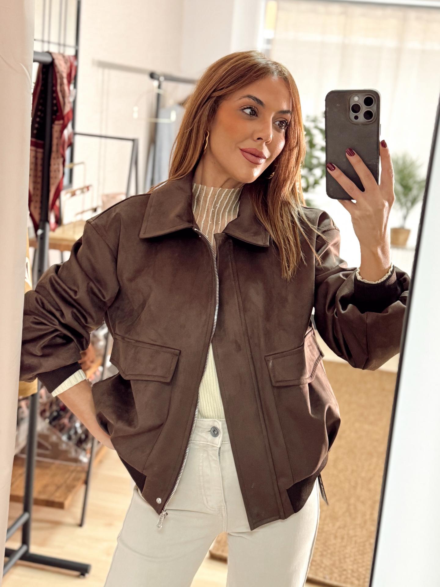 La bomber TRUEGA de nuestra maravillosa casa de firma está confeccionada con buen gusto pensando en una mujer con estilo. Confeccionado en un tejido de ante sintético con tejido semi acolchado y corte perfecto.