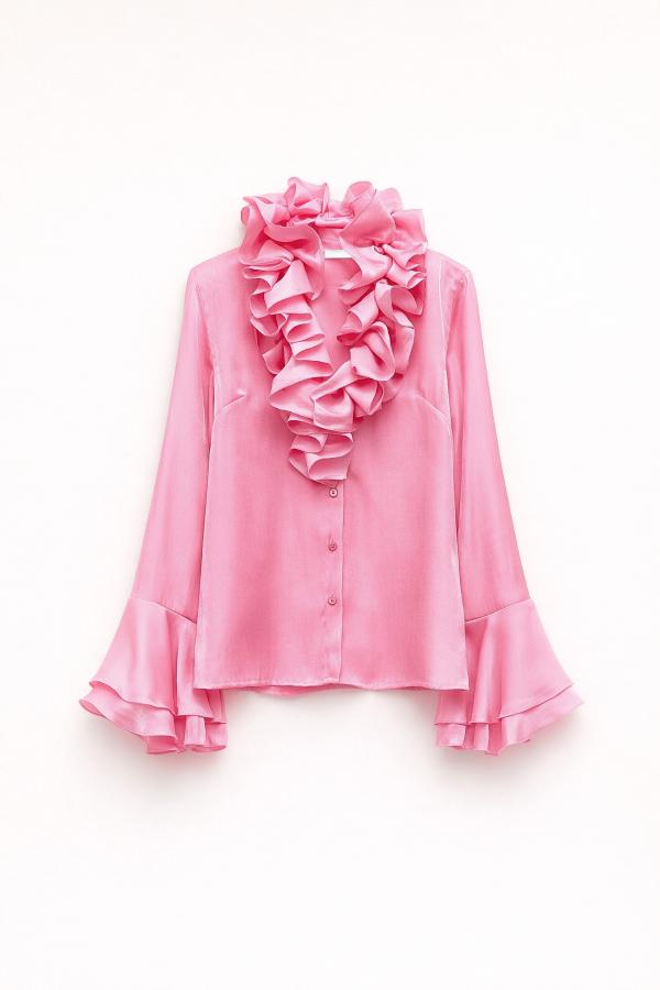 La camisa ODEREK de nuestra maravillosa casa de firma está confeccionada en tela de satén con espectacular cuello y manga acampanada