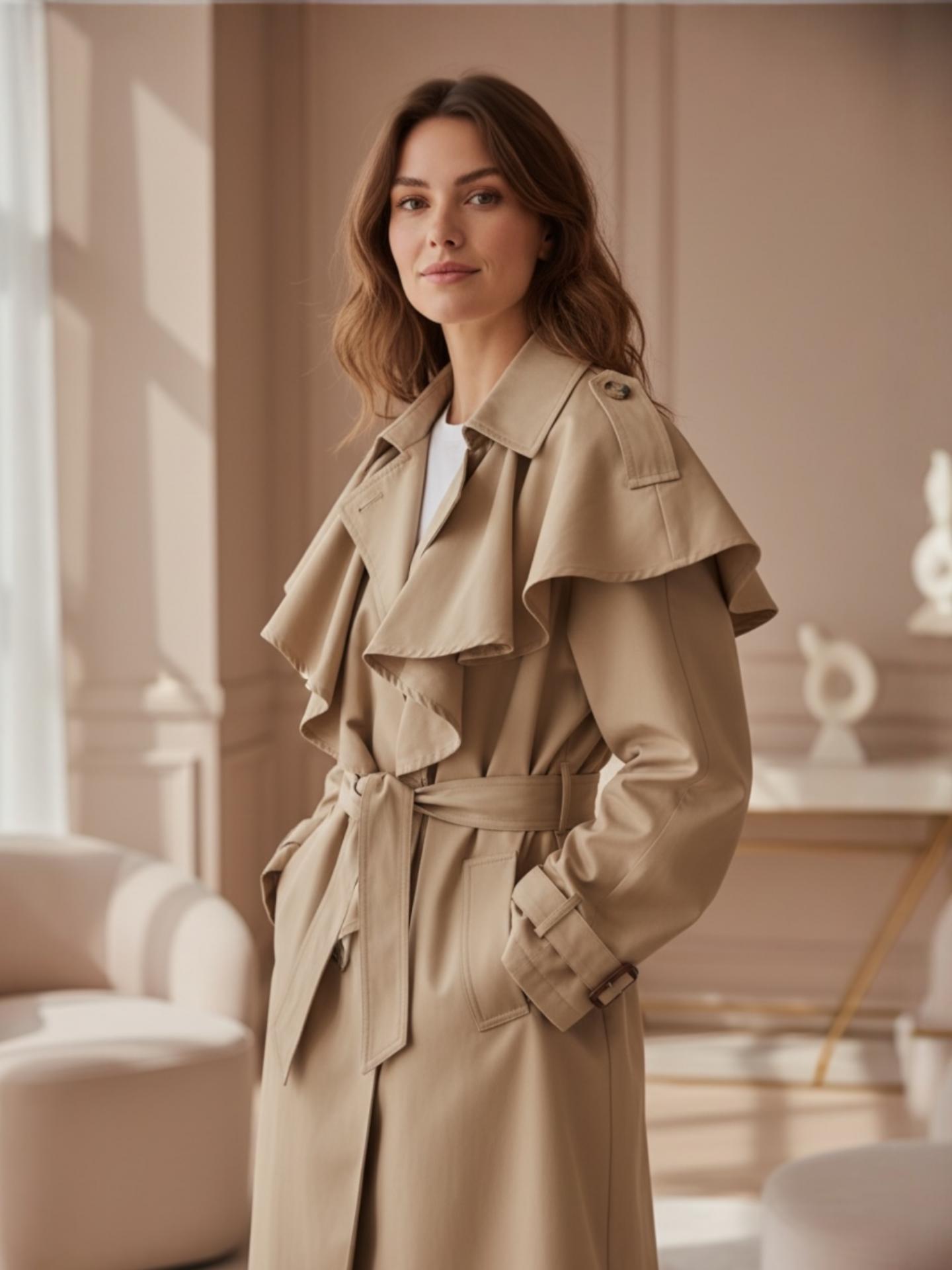 La gabardina NIED es espectacular en tejido y diseño. Nuestro modelo viene confeccionado en corte largo completamente forrado y un diseño con maxi volantes para hacer ceceo capa y lazada para entallar en cintura.
