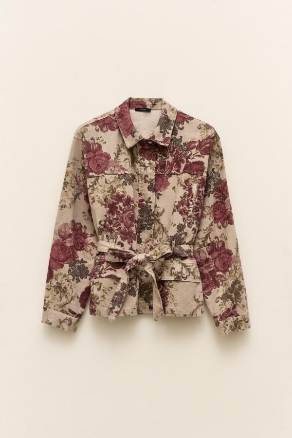 La chaqueta ALOVE viene en tejido efecto denim con corte Oversize y lazada para tallar en la cintura.