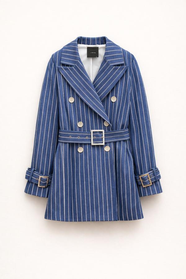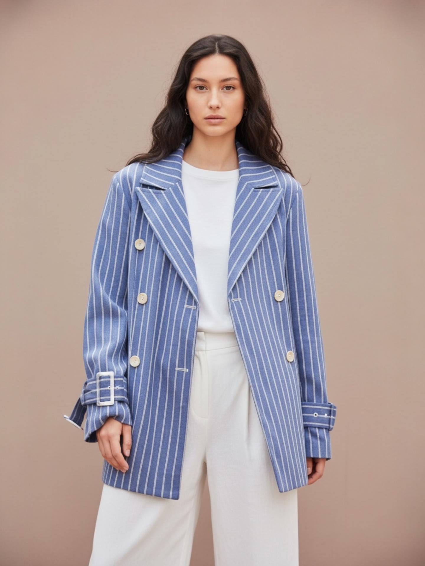 La chaqueta COUSIN pertenece a nuestra maravillosa casa de firma Lumina . iene en corte cruzado en mezcla de algodón. Estampado de rayas. Cuello con solapa y hombreras. Cierre frontal con botones y cinturón.