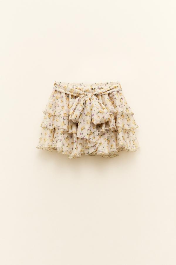 La falda KAIA pertenece a nuestra casa de firma Lumina. Estampado floral. Trabillas en la cintura con cinturón de cinta sobre mismo