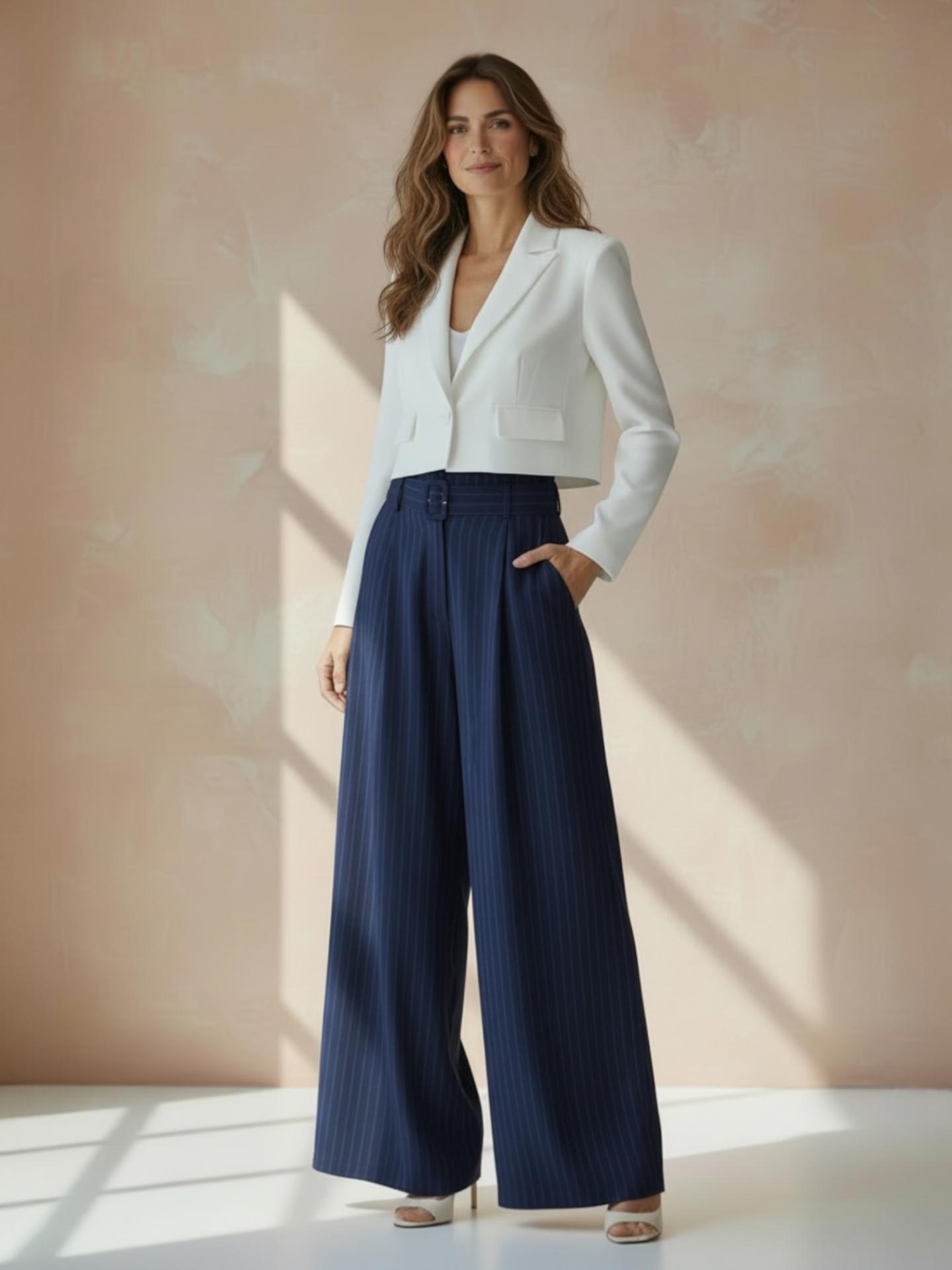Corte palazzo, tiro medio-alto y bolsillos laterales. Es muy elástico.