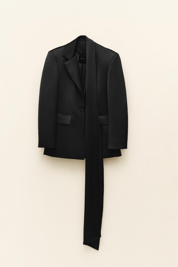 La chaqueta LOUMIN de nuestra maravillosa casa de firma Lumina viene confeccionado en un corte espectacular con tejido de satén. Lleva una solapa y efecto corbata