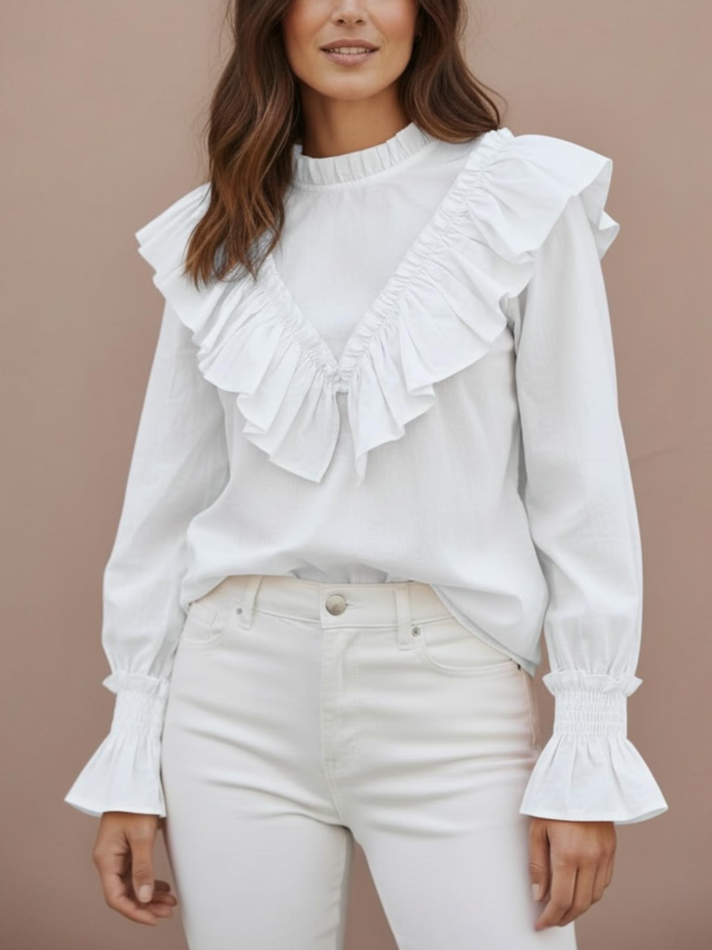 La camisa NURIA viene con tejidos semi transparente y volantes cortados al láser. Cuello Maho