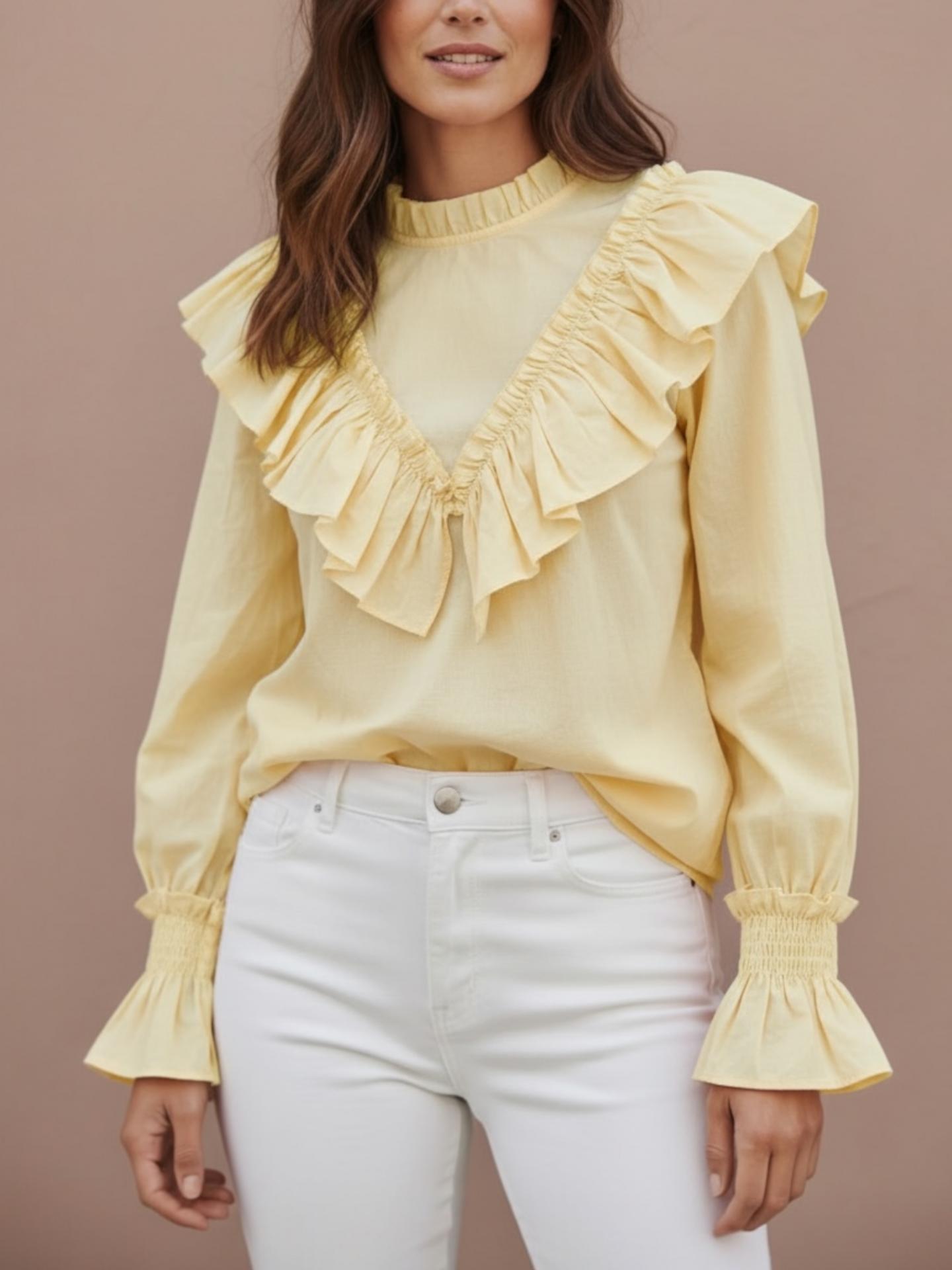 La camisa NURIA viene con tejidos semi transparente y volantes cortados al láser. Cuello Maho