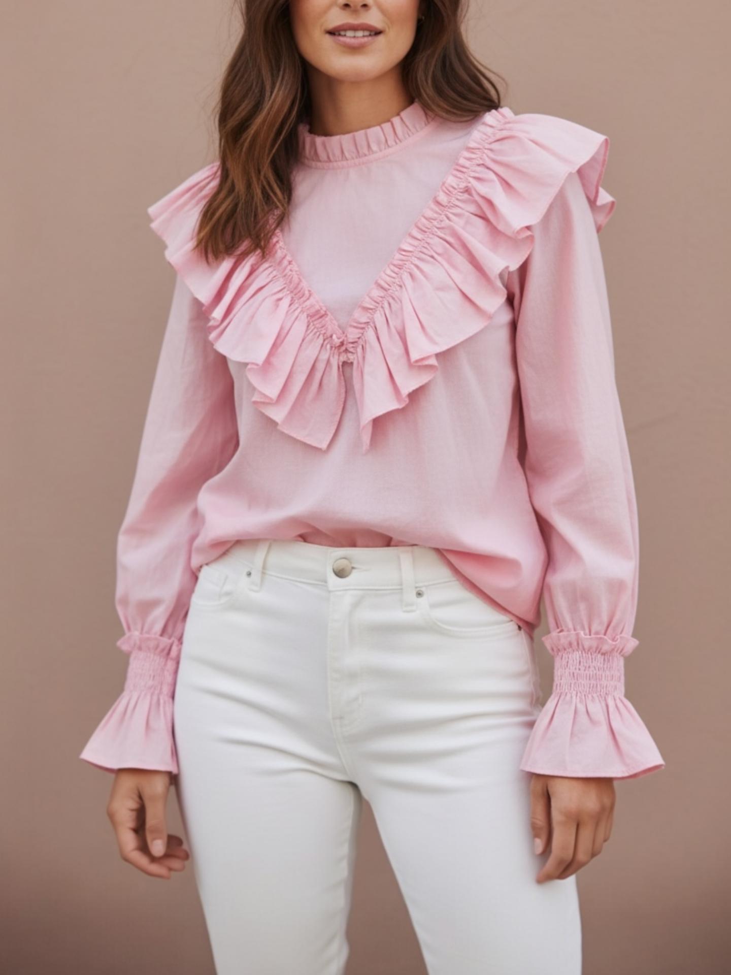 La camisa NURIA viene con tejidos semi transparente y volantes cortados al láser. Cuello Maho
