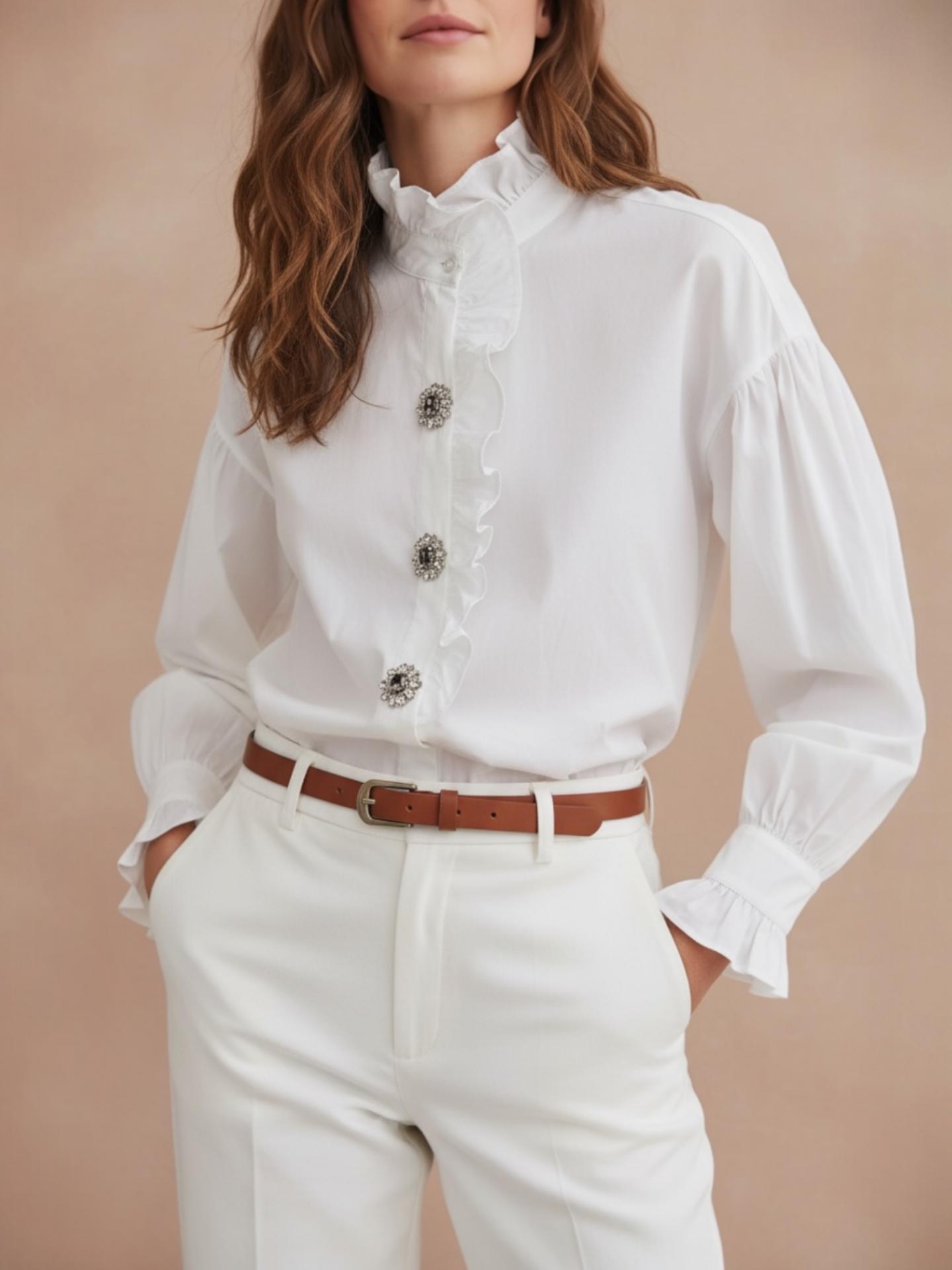 La camisa SILVIA viene con maravilloso tejido de tela con broches de pedrería.