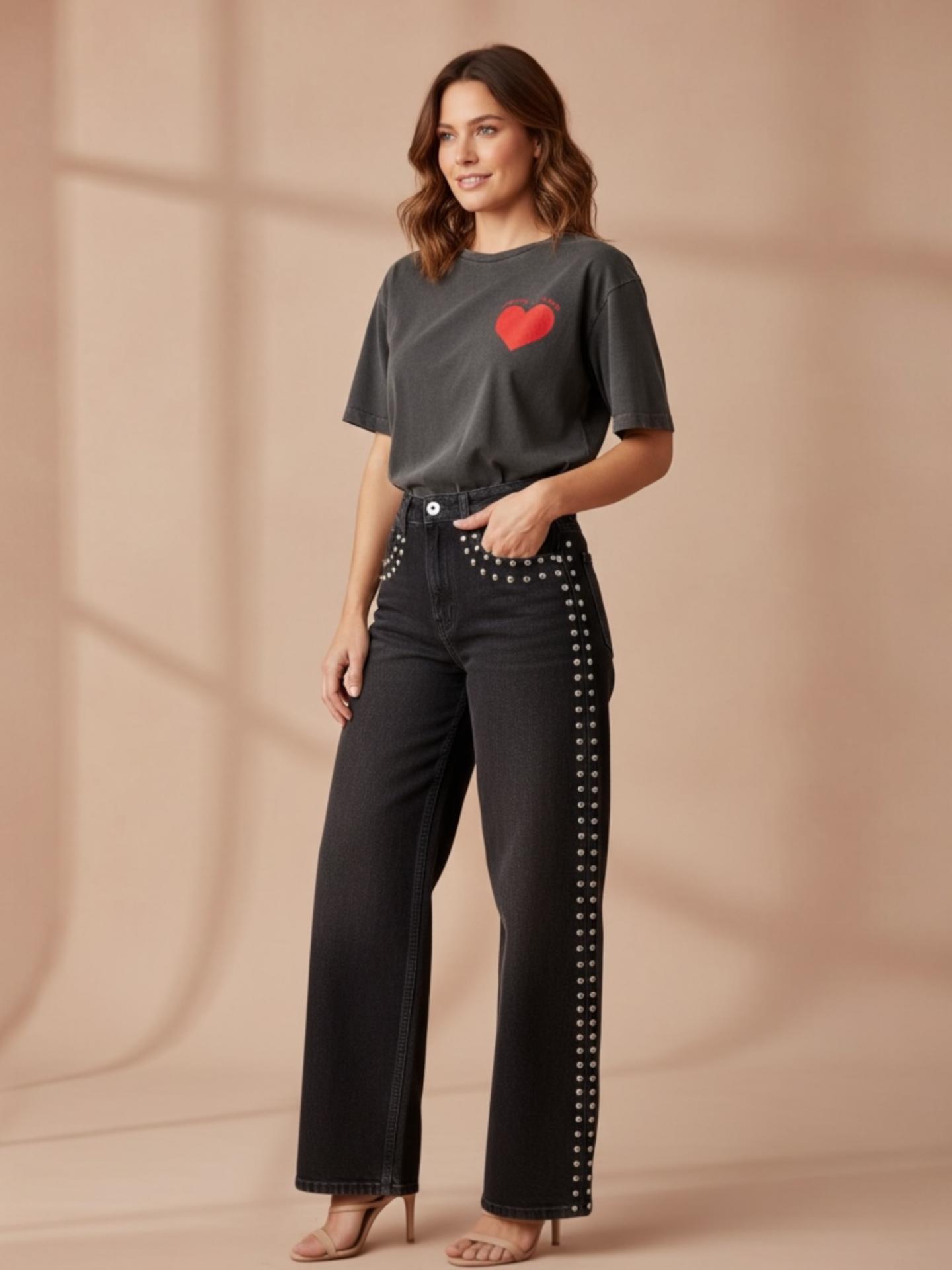 El jeans 7890 sienta de maravilla con ese corte recto y con tejido elástico y tiro medio-alto híper favorecedor. Hace efecto push up. Decorado de mini tachuelas