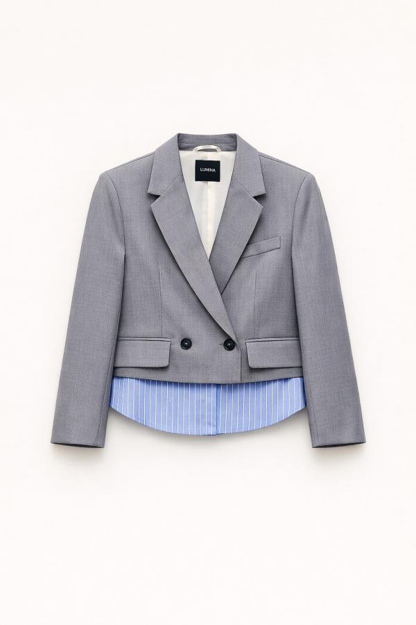 La chaqueta PAÓN de nuestra maravillosa casa de firma Lumina viene confeccionado en un corte crop espectacular con tejido combinado con bajo de camisa