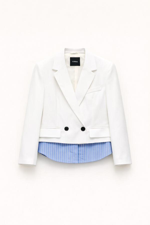 La chaqueta PAÓN de nuestra maravillosa casa de firma Lumina viene confeccionado en un corte crop espectacular con tejido combinado con bajo de camisa