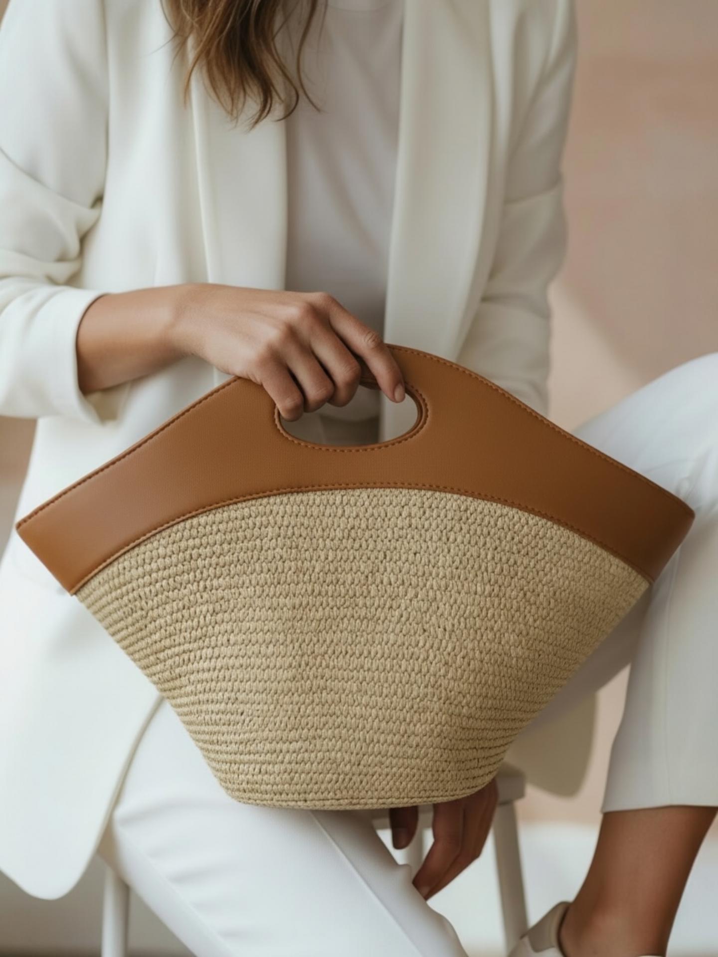 Bolso combinado con piel sintética y rafia. Lleva asa corta y larga regulable con cierre de cremallera.