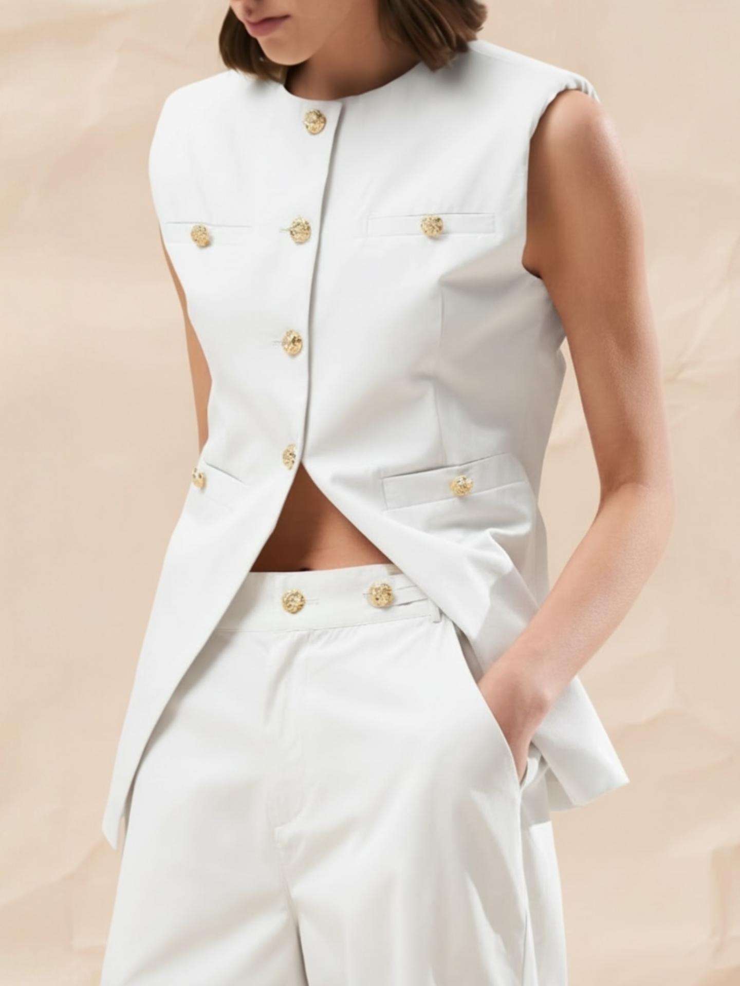 El chaleco FRANCE de nuestra maravillosa casa de firma Lumina está confeccionado con un maravilloso tejido efecto denim sedoso con mini hombreras y botones grabados dorados.