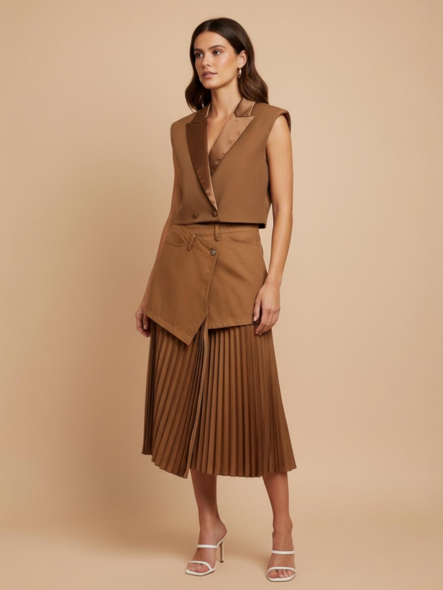 La falda VOILL pertenece a nuestra maravillosa casa de firma Lumina. Viene confeccionado en doble tejido combinando el denim con el tejido satinado plisado con una calidad superior. Talla muy amplio. Recomendamos coger una talla menor.