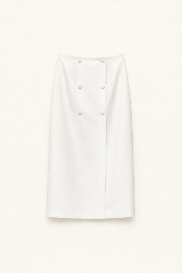 La falda KALA pertenece a nuestra maravillosa casa de firma Lumina. Viene confeccionado en corte midi recto con doble botonadura