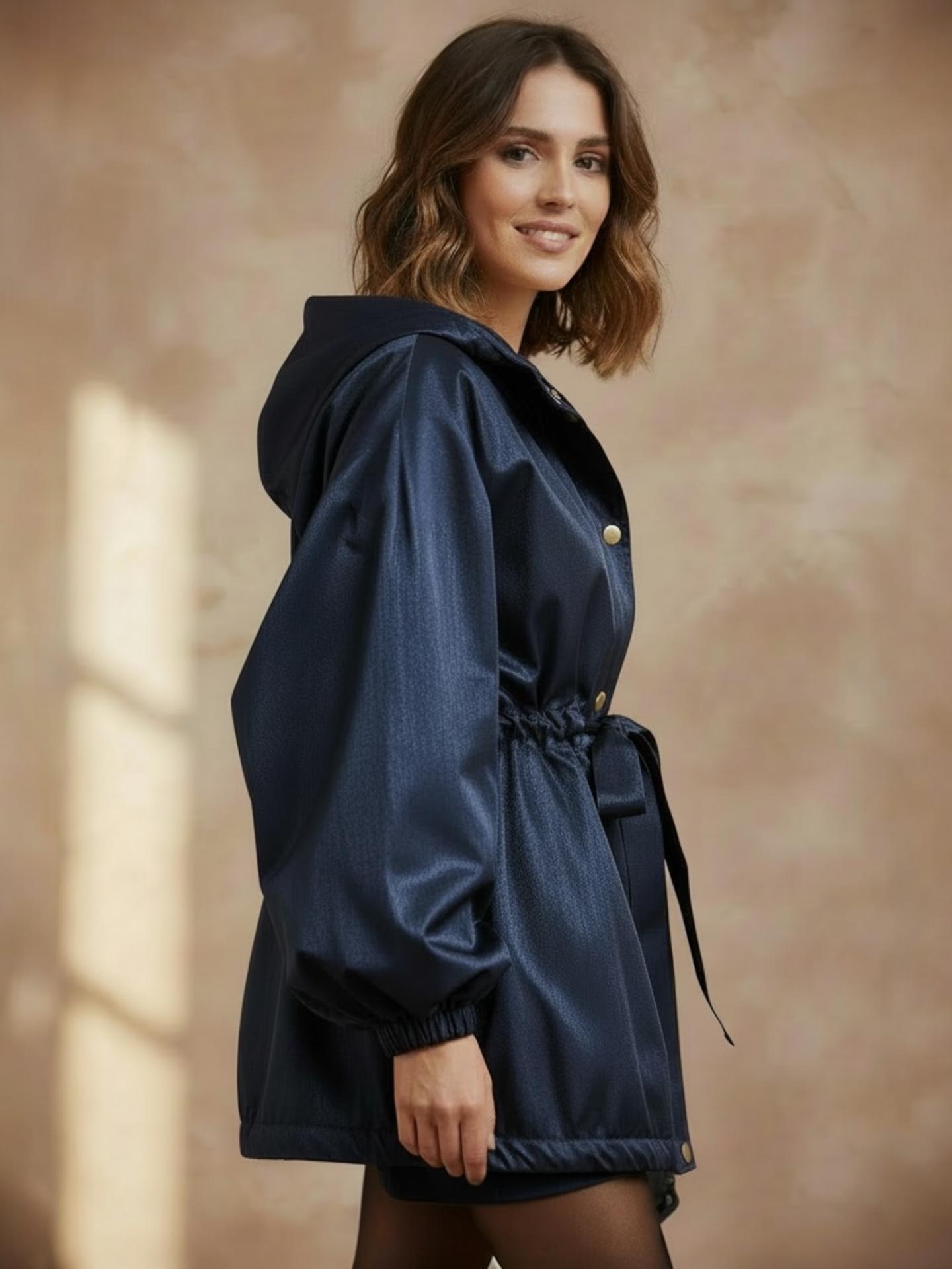 La gabardina DIERA es espectacular en tejido y diseño. Tejido impermeable con capucha y cierre de cremallera y corchetes dorados. Ajustable en cintura con lazo. Lleva bolsillos laterales