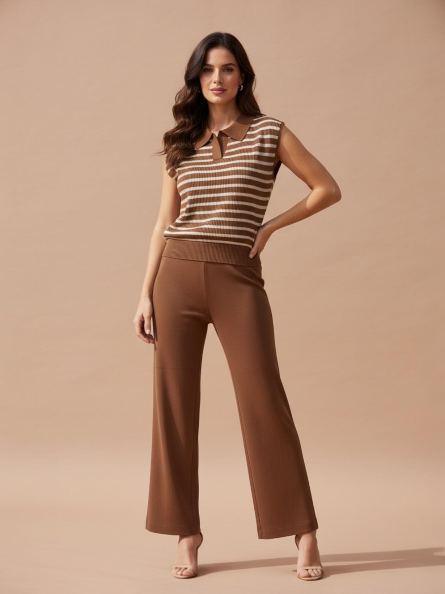 El conjunto TRÉBOL viene en tejido de punto con pantalón con cintura elástica y corte recto. Top amplio con solapas efecto polo.