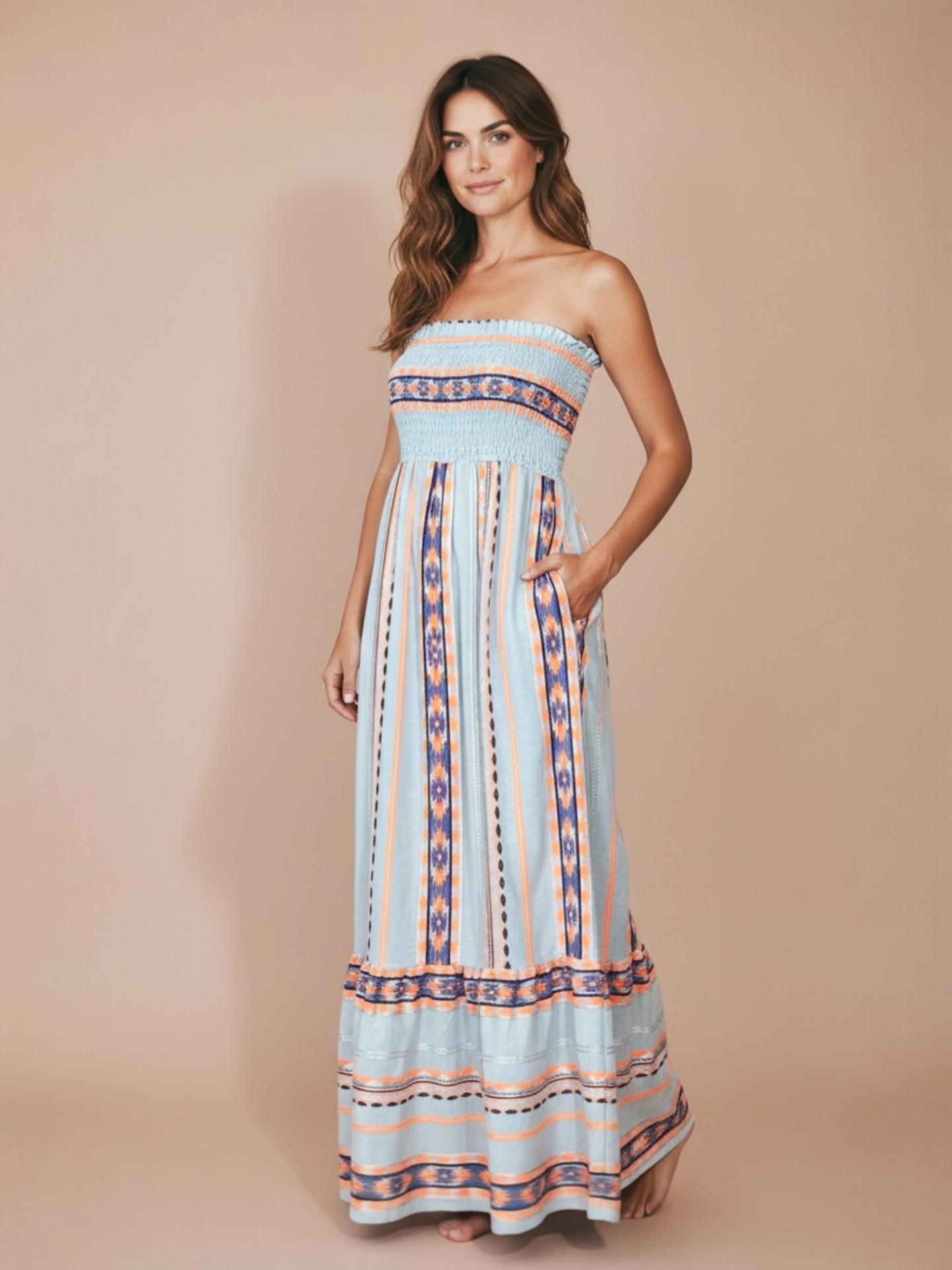 El vestido ETNIC con tejido muy elástico gracias a la parte superior que viene con nido de abeja, además de la cintura, ser muy elástica. Lleva bolsillos laterales y mucha caída con acabado de gran volante.